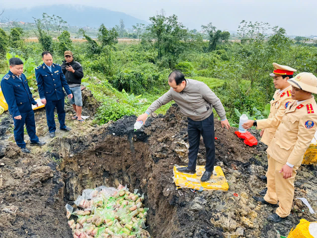 Trong quá trình khám phương tiện, lực lượng chức năng phát hiện trong khoang chứa hàng hóa có 04 thùng xốp, bên trong chứa chân giò đông lạnh (rút xương), với tổng trọng lượng hơn 200kg, trị giá hàng hóa trên 17 triệu đồng. Toàn bộ số hàng hóa không có nhãn hàng hóa, không có hóa đơn, chứng từ chứng minh nguồn gốc hợp pháp của hàng hóa, đang trong giai đoạn phân hủy và bốc mùi hôi thối, không bảo đảm điều kiện an toàn thực phẩm.